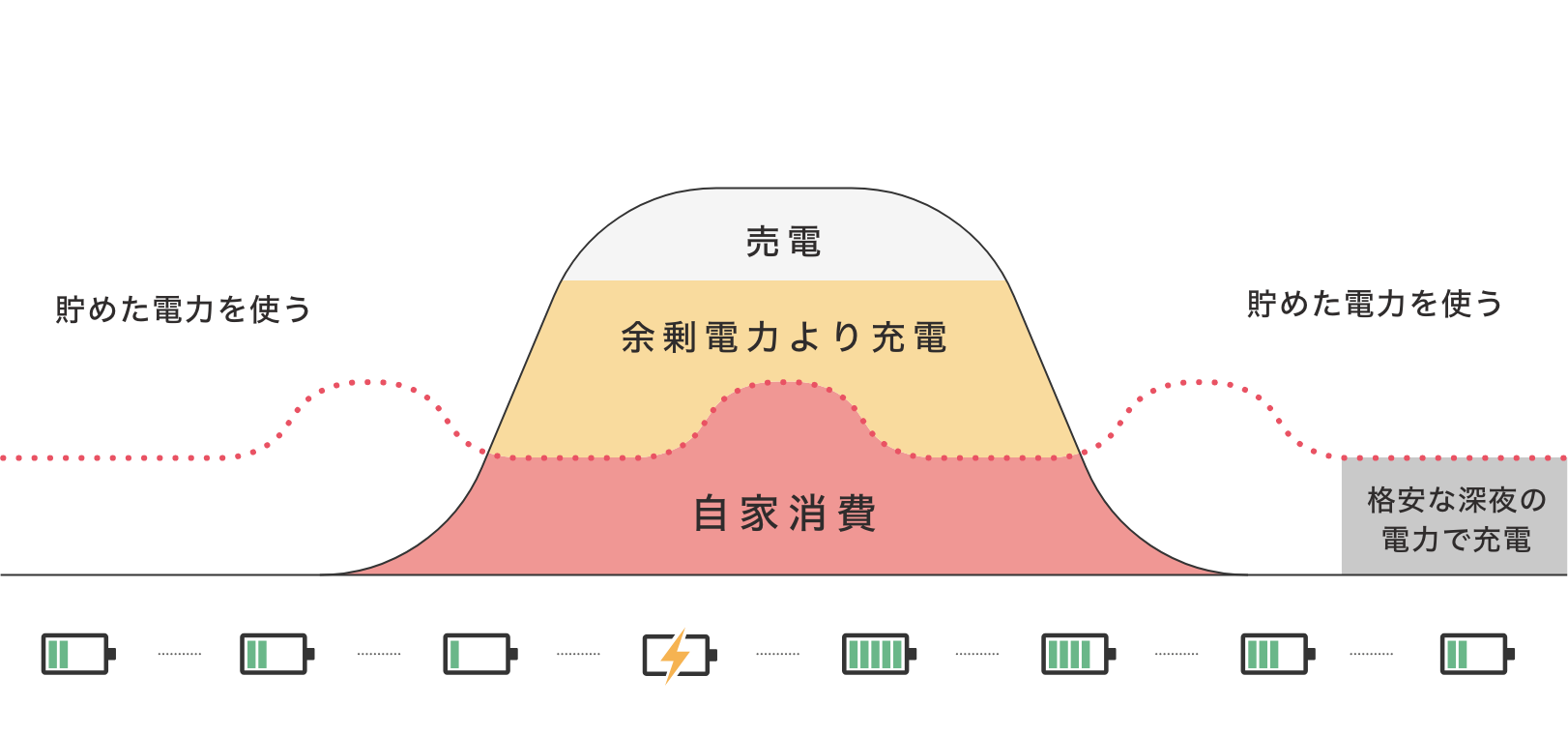 深夜に発電した電気を優先的に使用しながら充電し、夕方から深夜にかけて余剰電力を効率よく活用でき、購入する電気量が減り、料金節約できる家計に優しいモードです。余剰電力は売電で節約効果アップも期待できます。